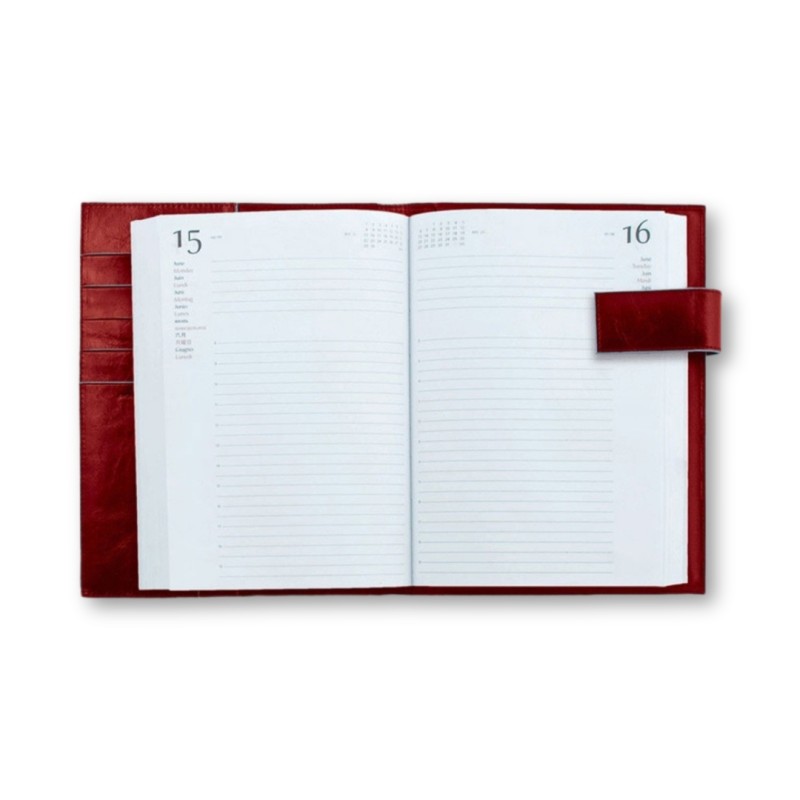 Leder-Tageskalender mit Klappe und Stifthalter.