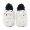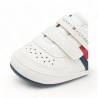Tommy Hilfiger Babyschuhe aus weißem Kunstleder mit seitlichem Flaggenprint. Die beiden Klettverschlüsse sorgen für einen bequemen Sitz. Die rutschfeste Gummisohle.