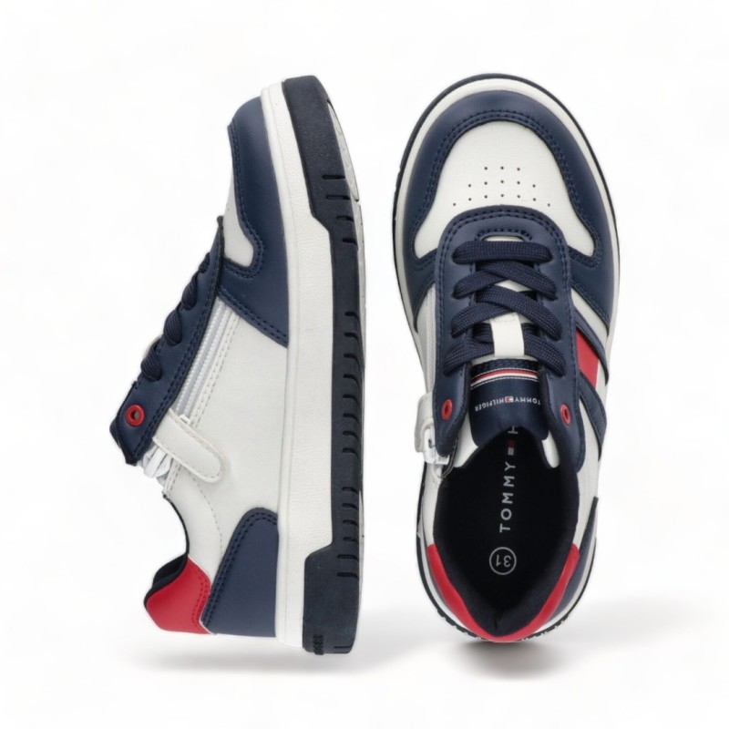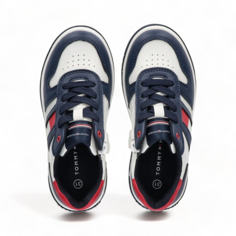 Tommy Hilfiger Schnürsneaker aus zweifarbigem Kunstleder mit seitlichem Flaggenprint. Die Sneaker zeichnen sich durch kontrastierende blaue Einsätze aus. Ein innenliegender Reißverschluss sorgt für sicheren Halt. Die Gummisohle ist rutschfest.