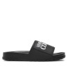 Slide-Sandalen mit Logo-Print auf der Vorderseite, Logo-Prägung auf der Rückseite, offener Spitze und flacher Gummisohle.
