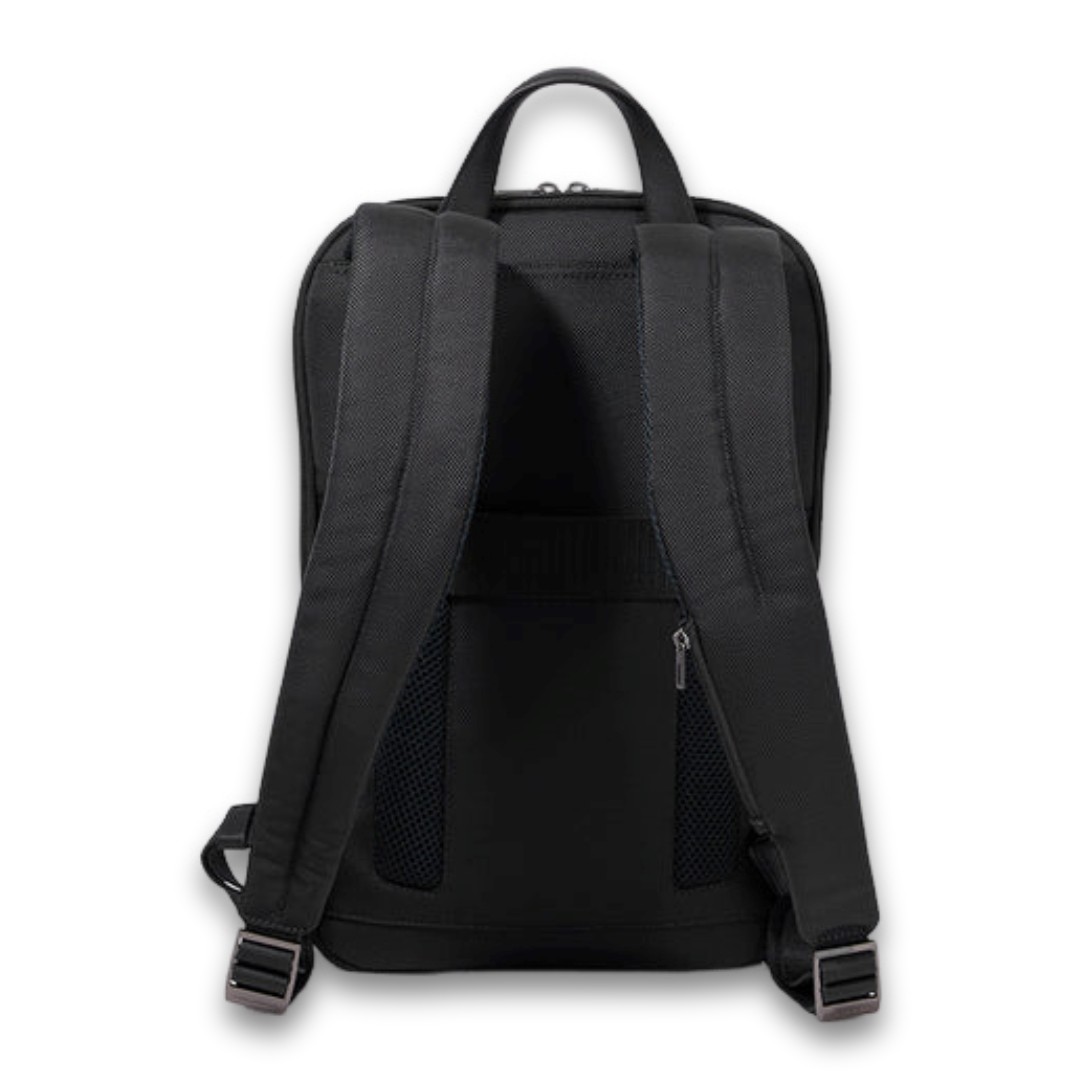 Schlanker Laptop- und iPad®-Rucksack aus recyceltem Stoff und Leder mit AirPods®-Tasche, stoßfest und mit RFID-Schutz, erweiterbar