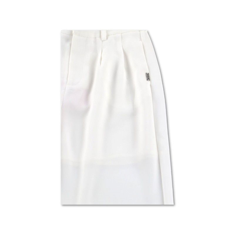 Hose mit Bügelfalten, Leistentaschen an den Seiten, Gummibund auf der Rückseite, Logoetikett aus Metall, verdeckter Knopf- und Reißverschluss, Gürtelschlaufen, ausgestellter Saum, Farbe Weiß