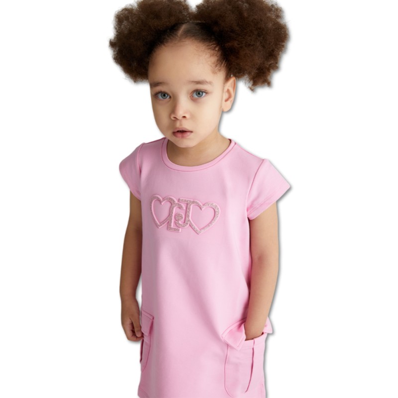 Kleid aus elastischer Baumwolle, Herzen und LJ-Lurex-Schriftzug auf der Vorderseite, Rundhalsausschnitt, kurze Ärmel, Pattentaschen an den Seiten