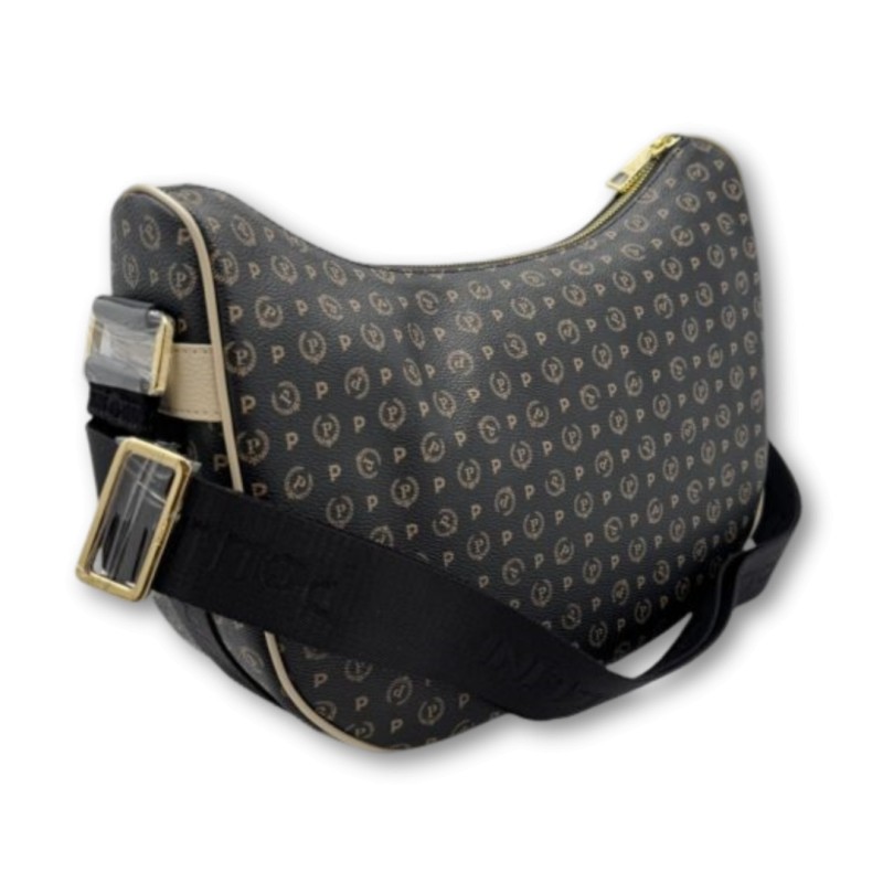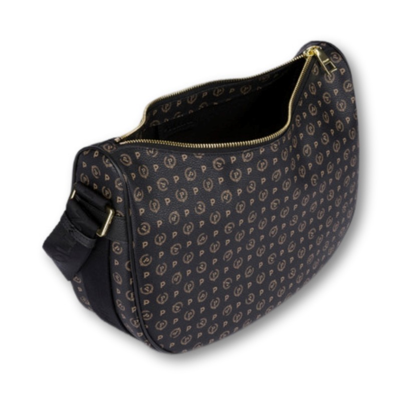 Hobo-Tasche aus der Heritage PVC-Kollektion. Das ikonische Allover-Muster verleiht ihr einen eleganten und zeitlosen Look. Das Pollini-Logoband verläuft seitlich an der Tasche und dient gleichzeitig als Schultergurt.