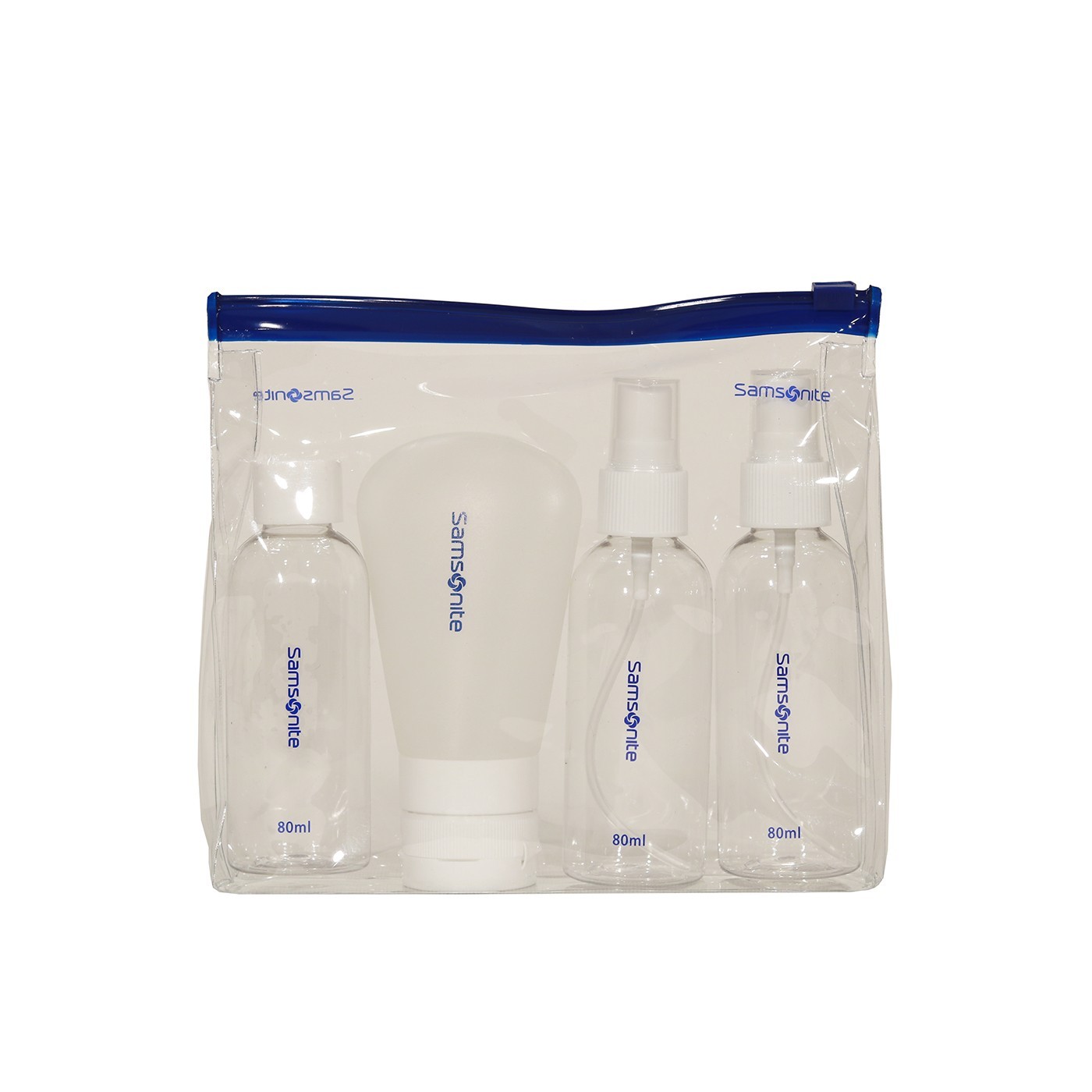 Set mit 4 Reiseflaschen, 2 Sprühflaschen, 1 Flasche mit Verschluss, 1 umgedrehte Silikonflasche, in einem transparenten Etui.