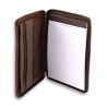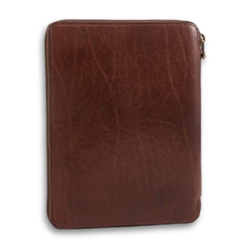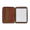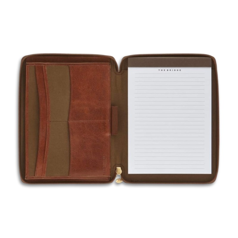 Notizblockhalter aus pflanzlich gegerbtem Leder. Durchgehender Reißverschluss. Innenausstattung aus Stoff und Leder. Kartenhalter, Dokumentenhalter, Stifthalter und Notizblock.