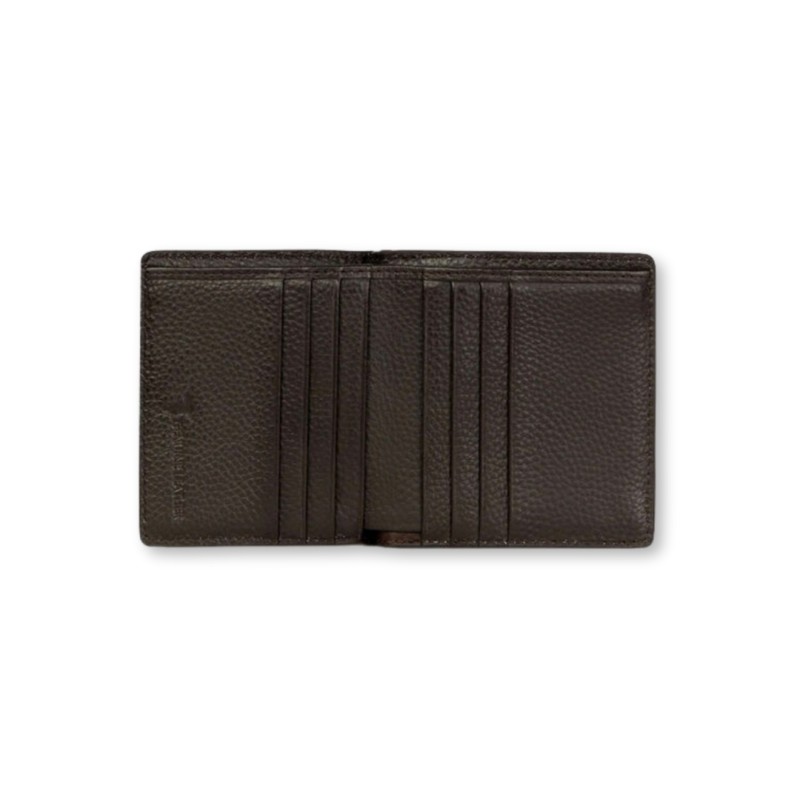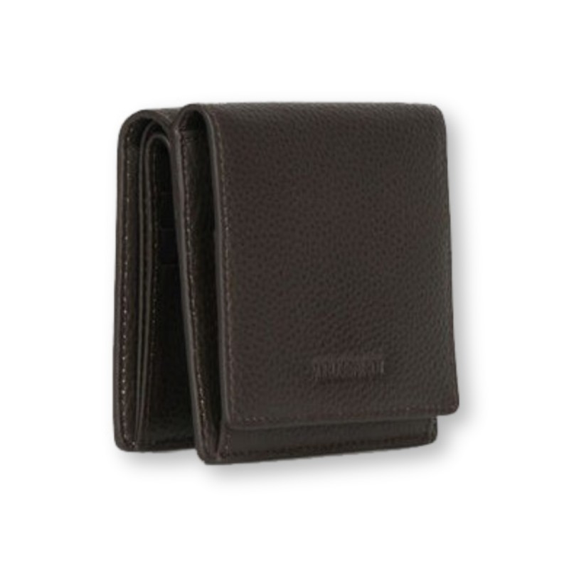 Cartera plegable de piel de color liso con característica textura martillada. El diseño compacto se caracteriza por el bolsillo para monedas con botón a presión en el lado exterior y el interior organizado con ranuras para tarjetas y bolsillos para billetes. Personalizado con inscripción Trussardi impresa ligeramente en relieve.