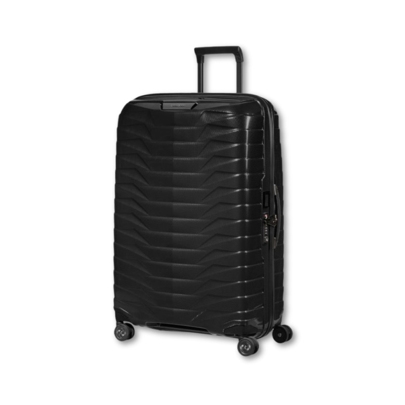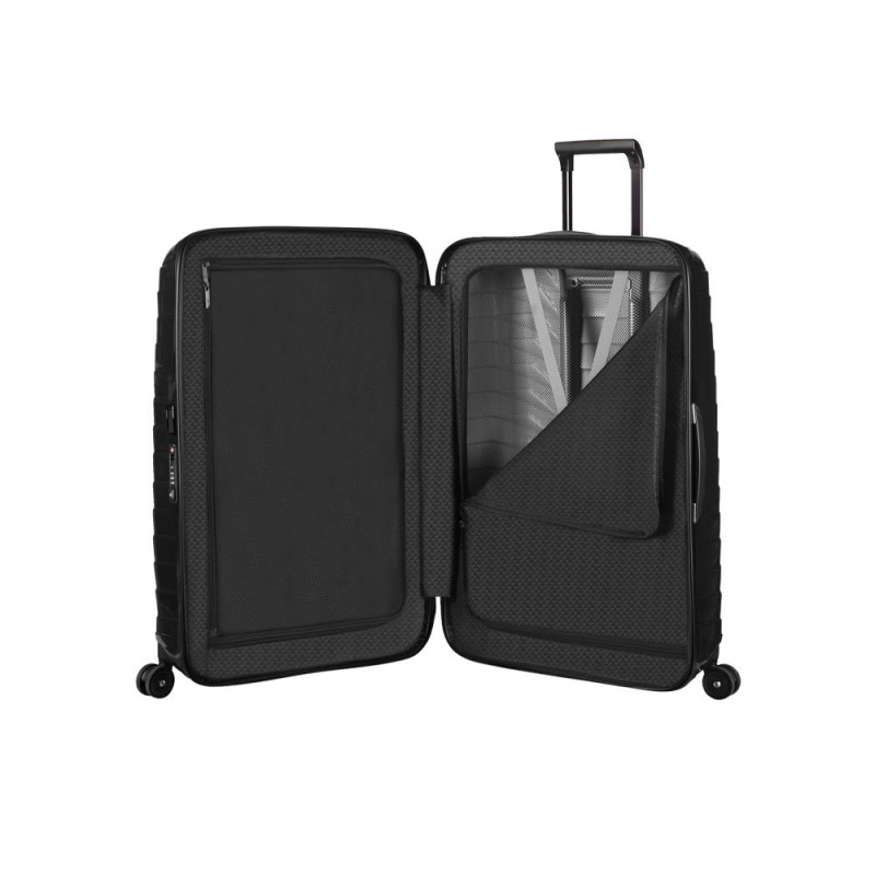 Trolley mediano Proxis, ultraligero (2,7 kg), bloqueo con función TSA, cuatro ruedas silenciosas para mayor comodidad en el viaje, compartimento inferior con divisor y bandas elásticas cruzadas. Capacidad 75 litros.