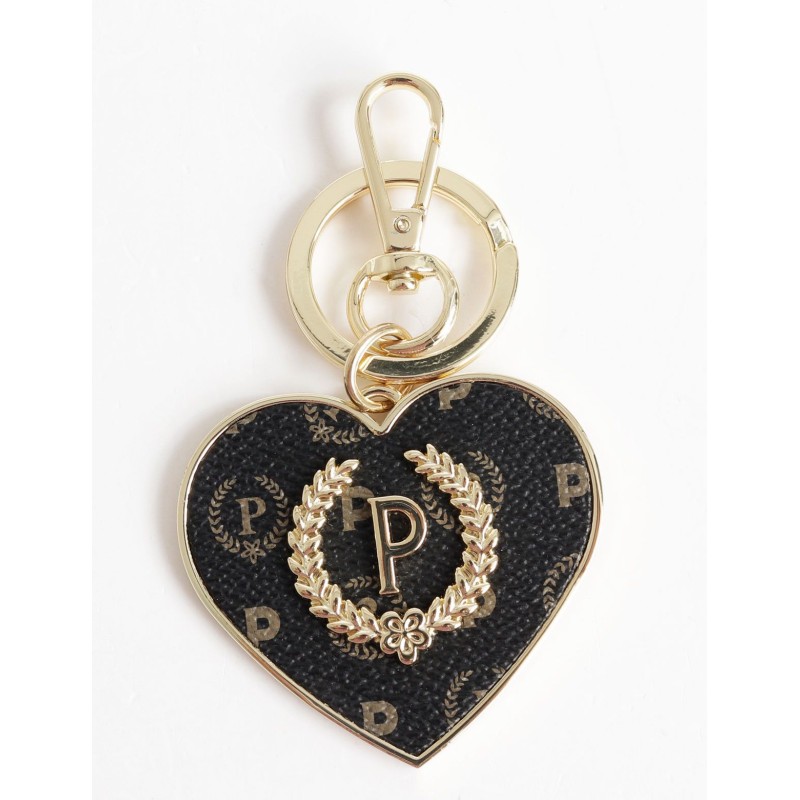 Llavero Pollini en forma de corazón de metal dorado e inserciones grabadas con logo por toda la prenda. Logotipo de metal con corona de laurel.