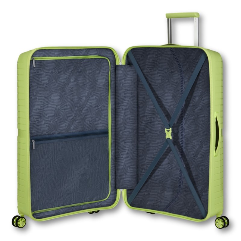 Carro Airconic grande fabricado en polipropileno duradero con cremallera recubierta repelente al agua, ruedas dobles de suave marcha, asas ergonómicas y cerradura empotrada con combinación de tres dígitos y función TSA. Correas interiores para ropa en la parte superior e inferior, capacidad 101 litros.