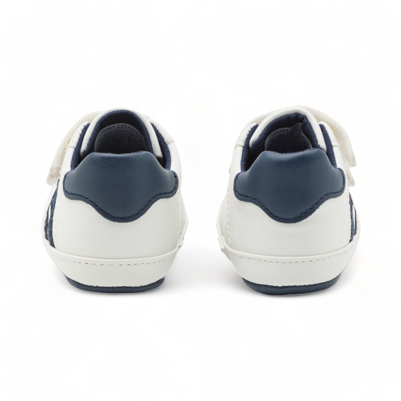 Zapatillas de cuna para bebé Tommy Hilfiger en ecopiel blanca con banderita en el lateral del zapato. Las dos correas de velcro permiten un ajuste cómodo y confortable. La parte inferior está fabricada en goma antideslizante.