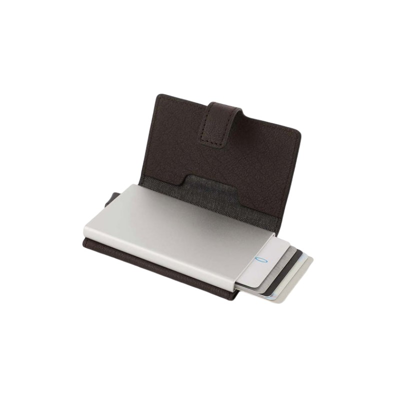 Tarjetero metálico con protección antifraude RFID y sistema deslizante