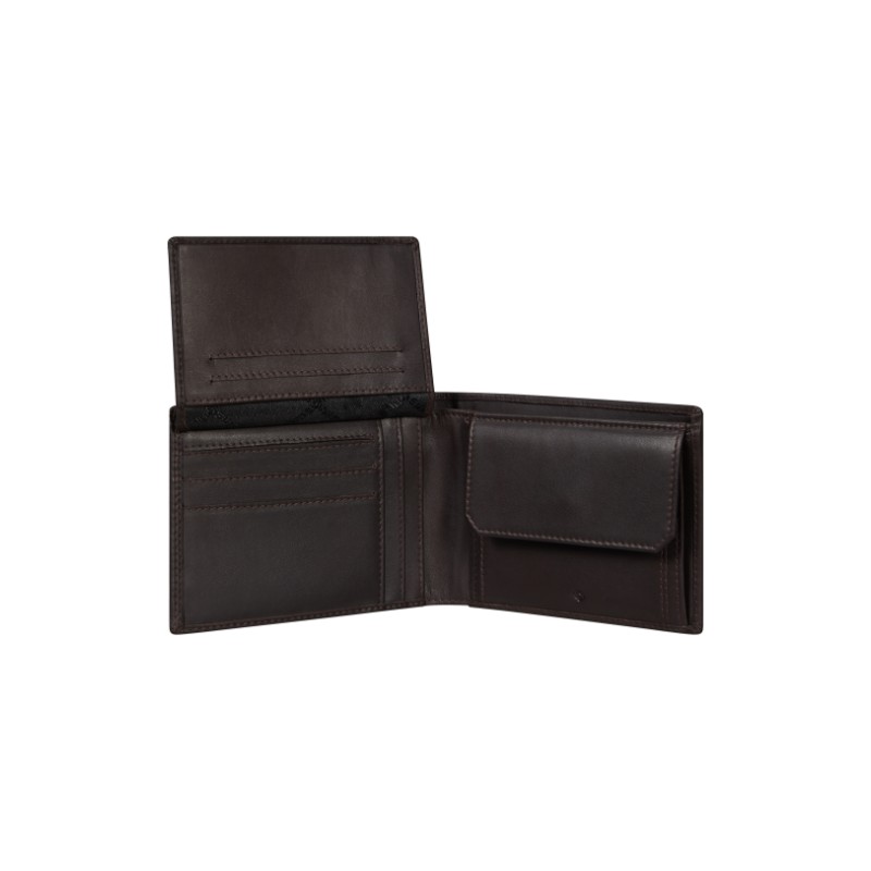 Fabricado en piel auténtica de alta calidad, con compartimento para documentos, doble compartimento para billetes, monedero cerrado con botón, solapa portadocumentos. Protección RFID. Logotipo de Samsonite en la parte delantera.