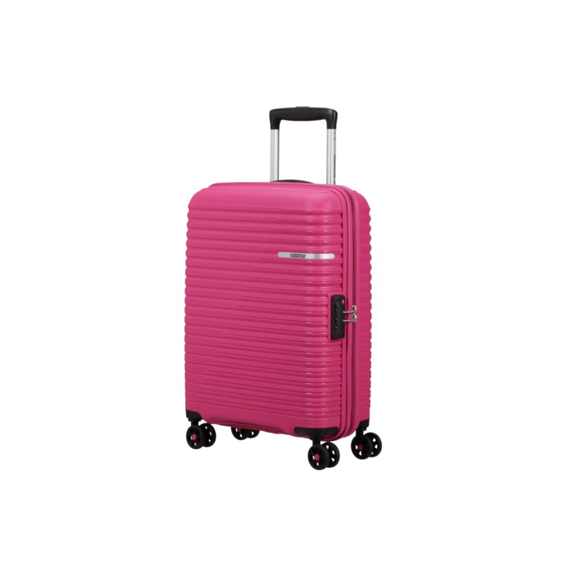 Carro LiftOff American Tourister en polipropileno con diseño inspirado en el nivel 3D, con cremallera a juego y logo metálico.