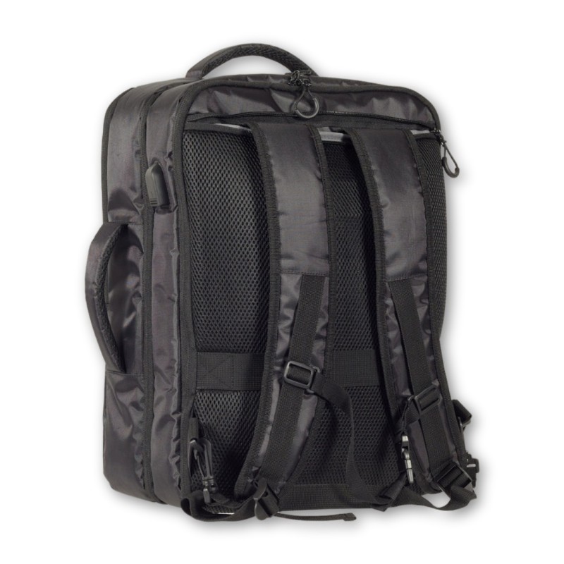 Parte trasera en material de malla transpirable con banda trasera diseñada para fijar al equipaje de mano.