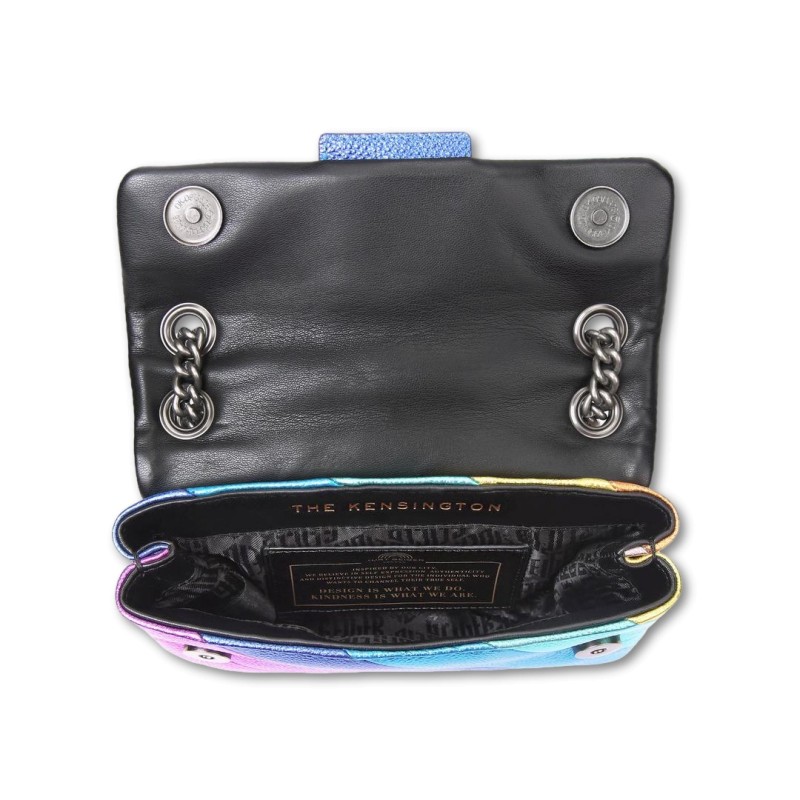 El bolso Mini Kensington está elaborado en piel de vaca granulada laminada metalizada con el icónico patrón de rayas diagonales de arcoíris cosidas. La cabeza de águila de plata envejecida presenta cristales de arco iris y ojos de cuentas negras en la solapa frontal.
