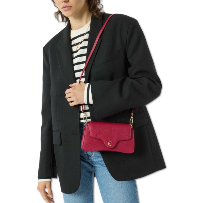 La funda para teléfono de la línea C-Me está adornada con el logotipo reinterpretado a través de la C de Coccinelle, que se anuda y abraza la púa, el elemento icónico de la marca. Su estilo femenino y elegante, gracias a los sinuosos detalles de la solapa, la hace perfecta para realzar cualquier look. Este modelo está elaborado con cuero procesado con maquinaria especial y posteriormente pulido para conservar su suavidad. Es un cuero muy duradero y fácil de limpiar, ideal para el uso diario.