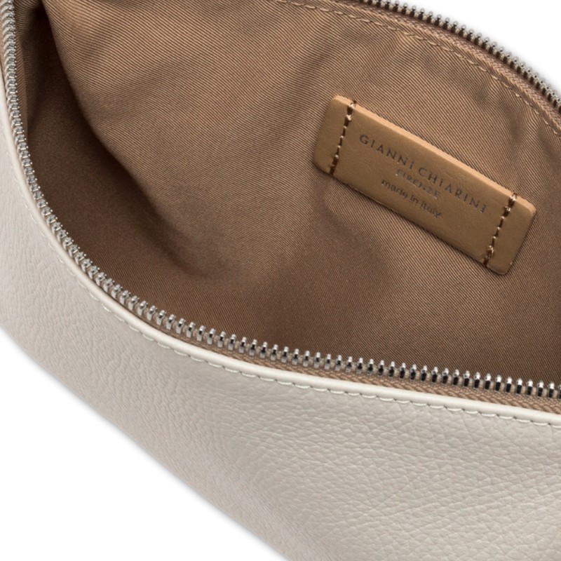 El clutch Hermy de Gianni Chiarini Firenze, ideal para llevar en la mano o en la muñeca, está elaborado en cuero martillado de primera calidad. Juvenil y divertido, presenta una cremallera en contraste y una fina correa de hombro extraíble. Ideal para completar looks casuales, pero también perfecto para una noche elegante.