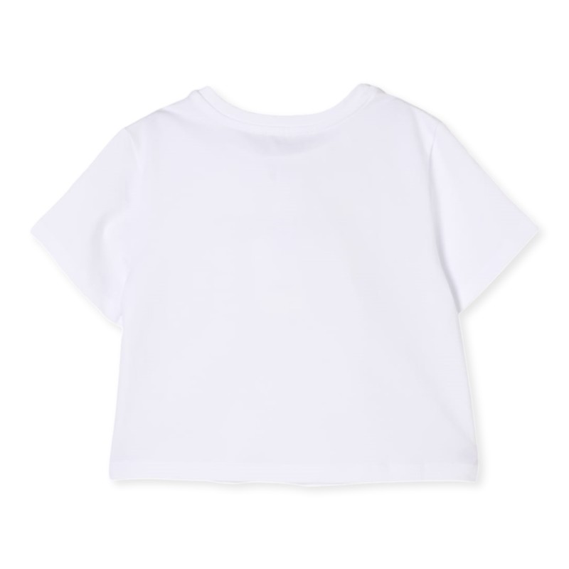 Camiseta cropped Twinset de algodón elástico, maxi logo con tachuelas y pedrería en la parte delantera, cuello redondo, manga corta.