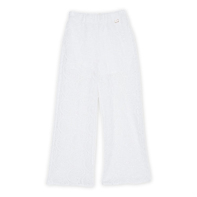 Pantalón twinset en encaje macramé, corte recto, cintura elástica, placa metálica con logo, forro de muselina de algodón.