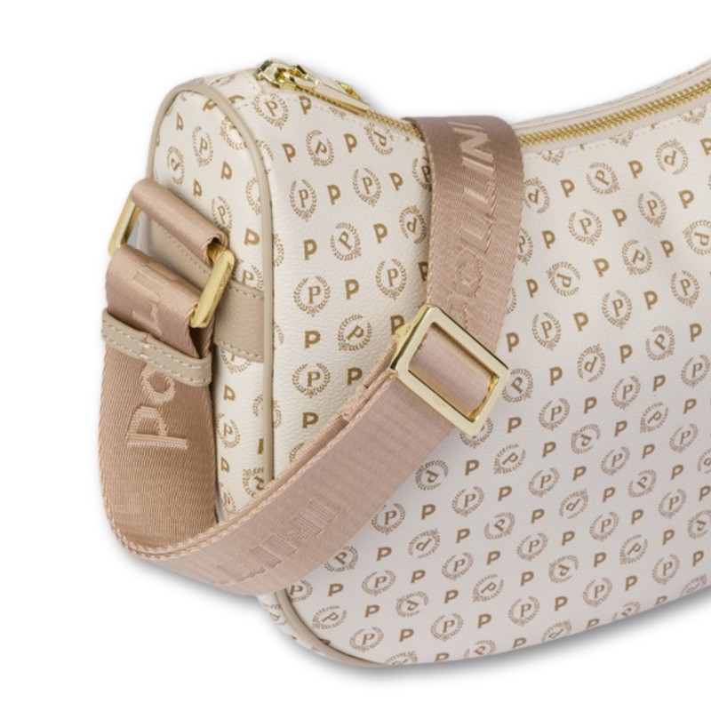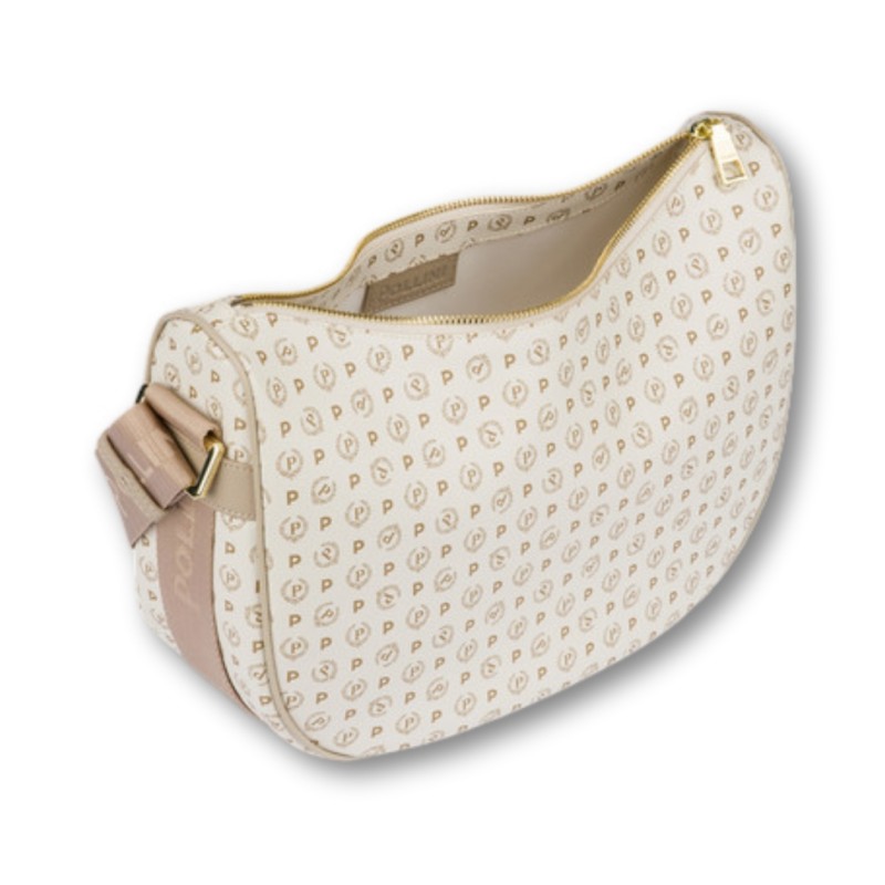 Bolso hobo de la colección Heritage PVC. Su icónico estampado integral le confiere un aire elegante y atemporal. La cinta con el logotipo de Pollini recorre el lateral del bolso y funciona también como bandolera.
