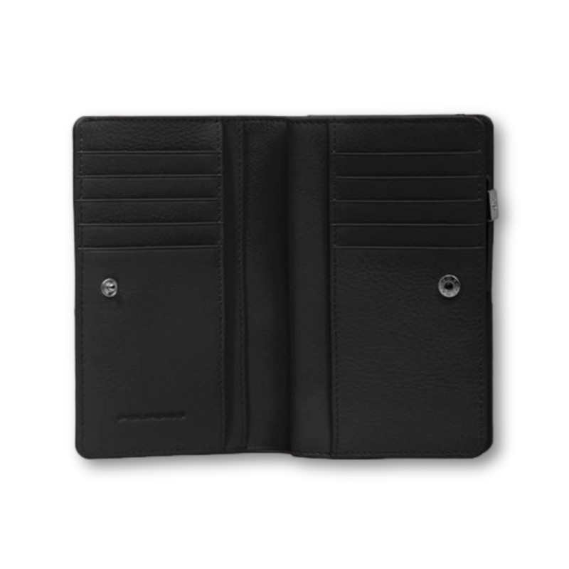 Cartera mediana de mujer con monedero en tejido reciclado y piel, ranuras para tarjetas de crédito y protección RFID.
