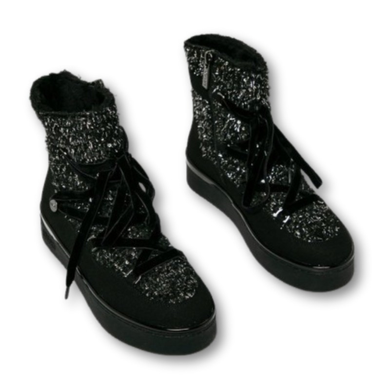 Botín en ANTE Y TEJIDO BRILLANTES.Plantilla de piel, Suela de goma de 3cm.CIERRE DE CREMALLERA LATERAL. CROMADO EN PINTURA NEGRA CON LOGO ESCRITO EN LA SUELA