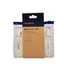 Juego de 4 frascos de viaje, 2 frascos con atomizador, 1 frasco con tapón, 1 frasco de silicona invertida, contenidos en un estuche transparente.
