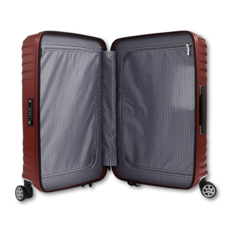 Carro mediano Tunes de policarbonato con cuatro ruedas silenciosas y multidireccionales para mayor comodidad durante el viaje. Cerradura de combinación de 3 dígitos integrada con función TSA y compartimento inferior con divisor y elásticos cruzados. Capacidad 74 litros, peso 3 kg.