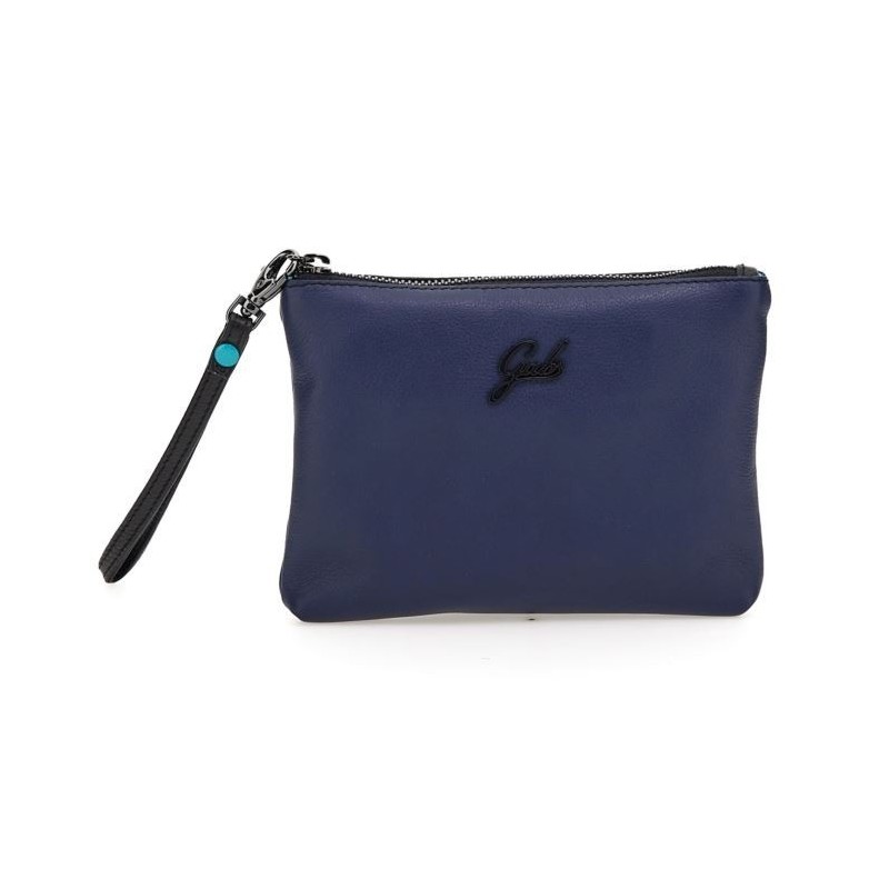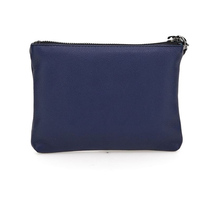 Le sachet en cuir nappa souple, doublé intérieurement de tissu turquoise, est équipé d'une bandoulière pour le porter au poignet. Pratique à conserver dans son sac comme trieur de documents, il devient également très beau porté à la main pour sortir rapidement. La fermeture est avec zip. Dimensions : 18 x 13,5 x 1 cm.
