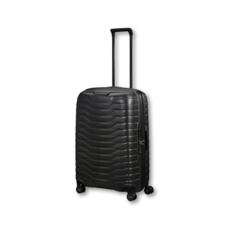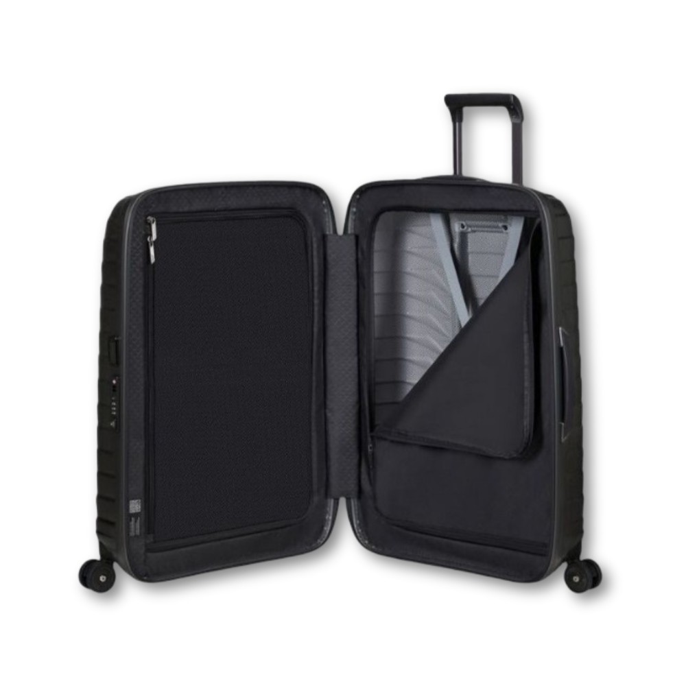 Chariot moyen Proxis, ultra léger (2,7 kg), verrouillage avec fonction TSA, quatre roues silencieuses pour un plus grand confort de voyage, compartiment inférieur avec séparateur et élastiques croisés. Capacité 75 litres.