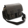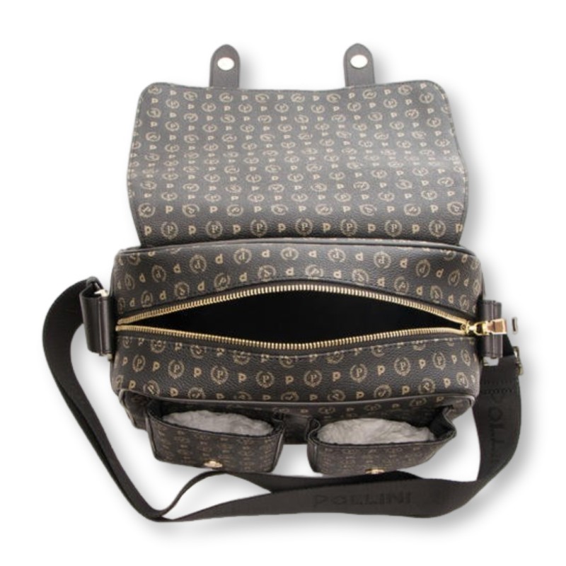 Sac pour femme de la collection Pollini's Heritage, en tissu gaufré avec logo et cuir naturel, équipé d'une ouverture à rabat et bouton-pression et d'une fermeture éclair, bandoulière en ruban réglable.