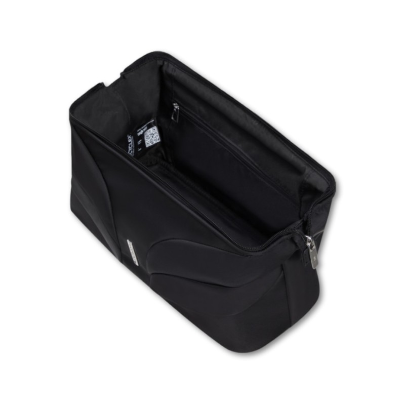 Nécessaire en tissu recyclé robuste. Grande poche principale fermée par zip. Intérieur organisé avec poches pour petits objets.