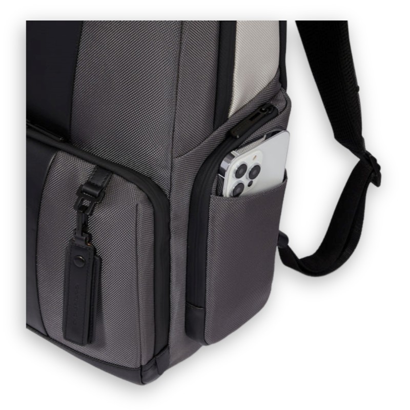 Sac à dos à contrôle rapide pour PC et iPad® en tissu et cuir recyclés avec sangle de poitrine, protections antichoc et anti-fraude RFID et poche pour AirPods®