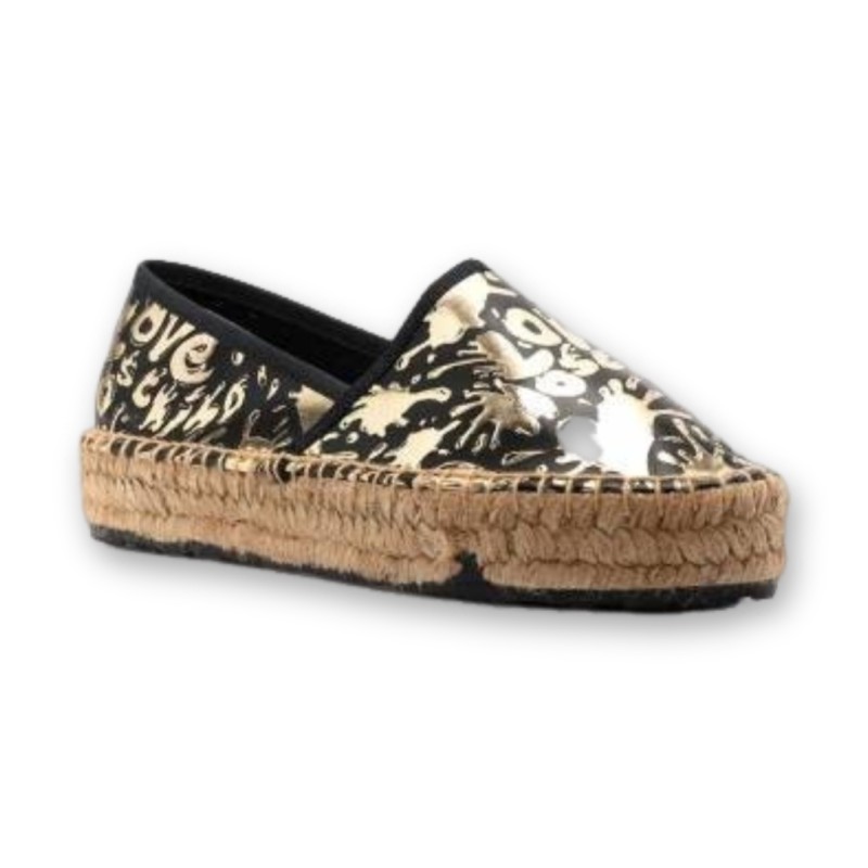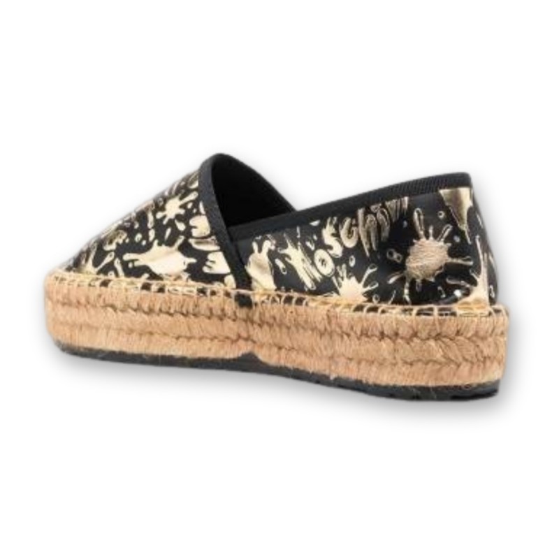 À enfiler avec logo imprimé all-over, effet métallisé, semelle en raphia tressé et bout arrondi.