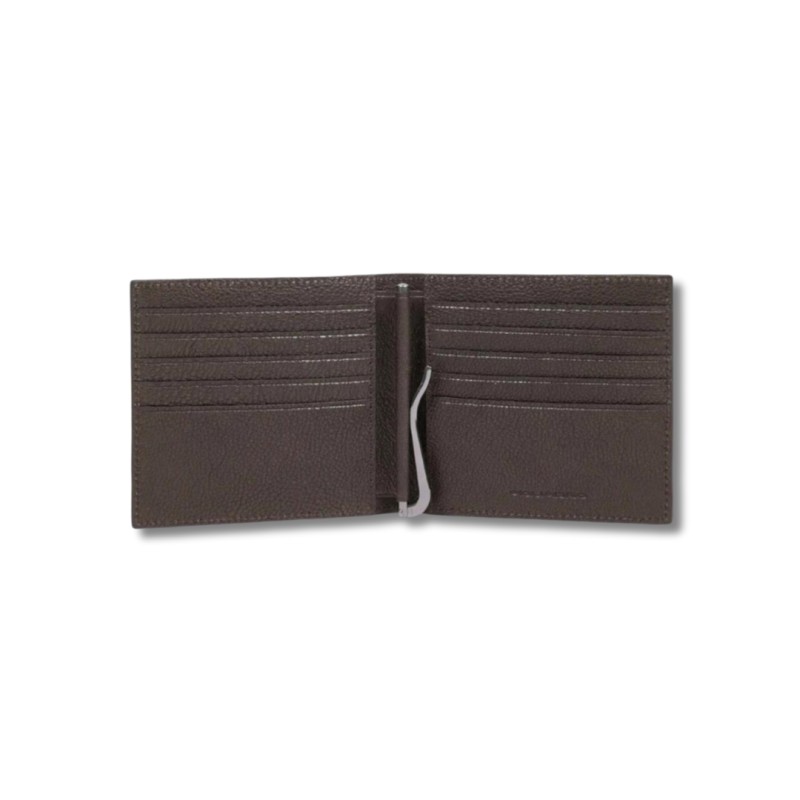 Piquadro card holder equipped with credit card slot and money clip for holding banknotes. The model is equipped with an anti-fraud RFID protection system for credit cards