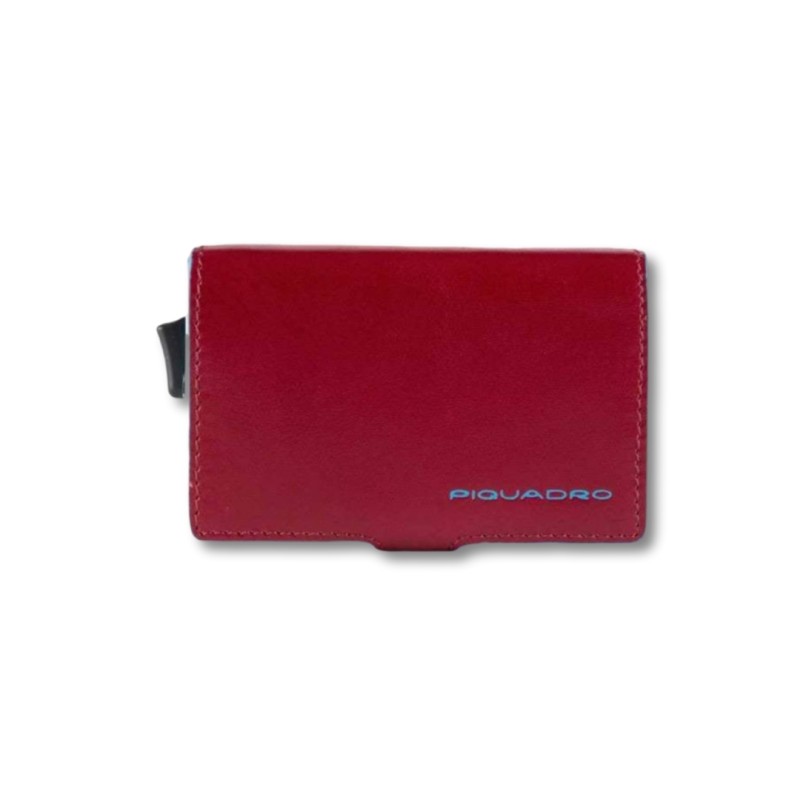 Piquadro card holder with button closure, sliding system, RFID protection, 12 slots for cards, 3 compartments, one of which holds banknotes.