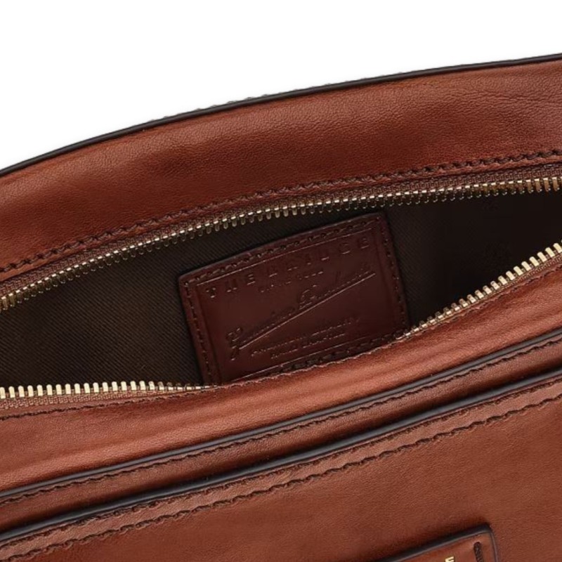 The Bridge beauty case made of genuine tan leather with pockets for objects.