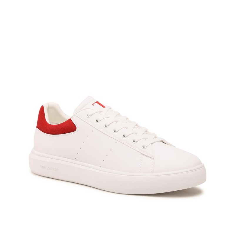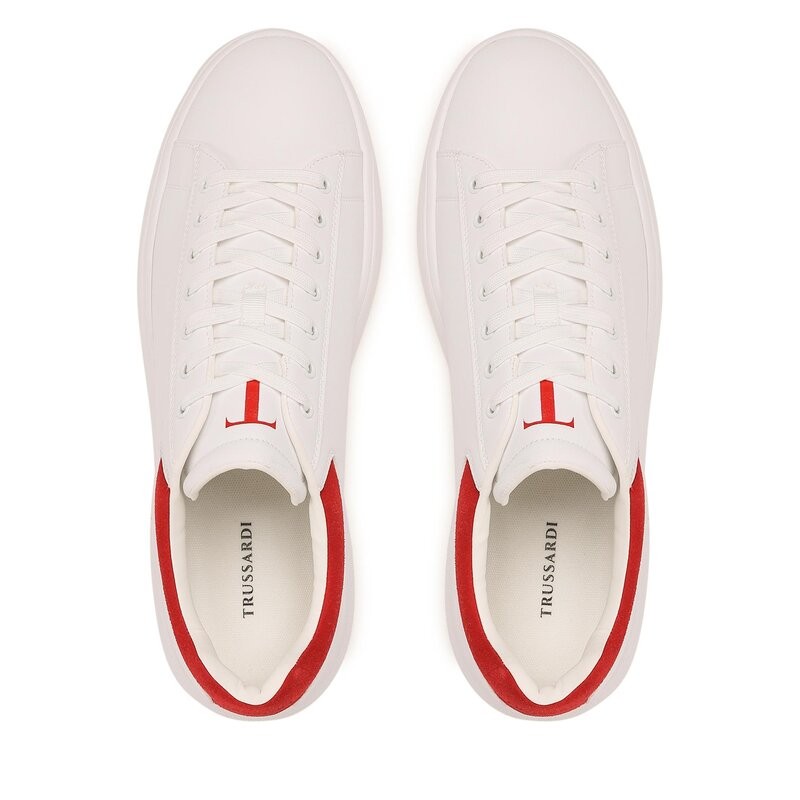 Yrias low top sneaker made of soft, solid color imitation leather. The model features a rear suede insert embellished with Trussardi lettering, also imprinted on the side of the sole. The tongue is finished with a small monogram logo. Lace closure.