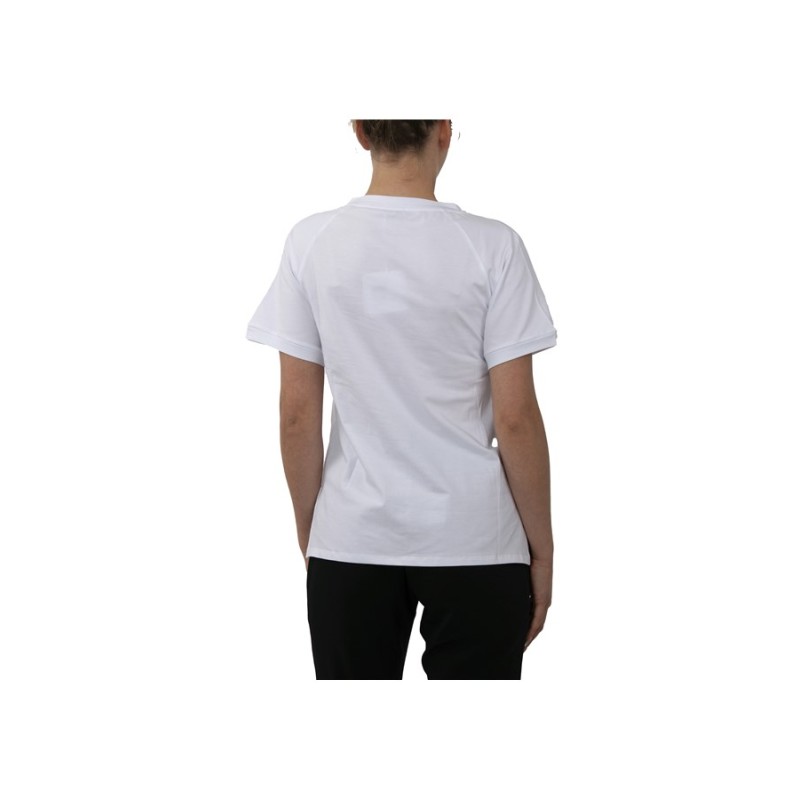 Complete your on and off duty outfits with this eco-sustainable cotton jersey t-shirt with front print, writing and rhinestone application. It has a straight fit, round neck, short kimono sleeves and side slits at the hem.
