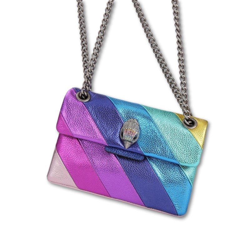 The Mini Kensington Bag is crafted from metallic laminated pebble grain cowhide leather with the iconic stitched diagonal rainbow stripe pattern. The antiqued silver eagle head features rainbow crystals and black beaded eyes on the front flap.