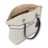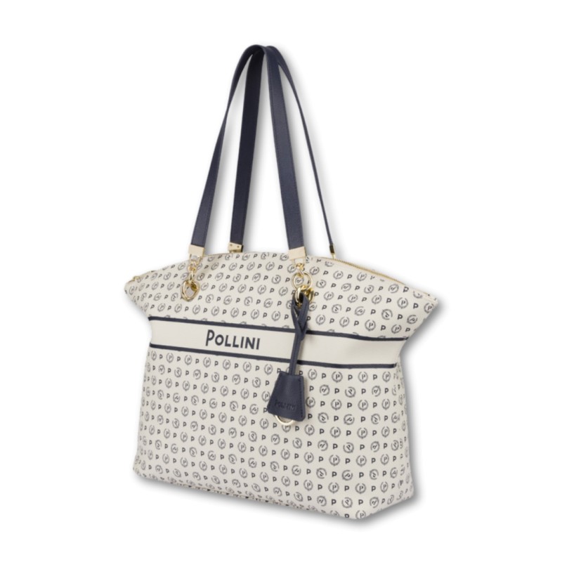 Practical Tote bag created for the exclusive Heritage Marina capsule collection. Shoulder bag created for the exclusive Heritage Marina capsule collection, inspired by summer marine atmospheres. The Heritage PVC takes on a new color given by the combination of ivory with a sea blue pattern. The bag is characterized by the Pollini lettering logo placed on the front dial. Interchangeable and removable double handles.