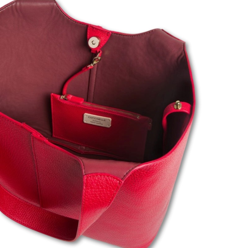 Coccinelle C-Easy is a tote bag featuring sinuous curves that enhance the beauty of the leather. Its functionality is expressed by its spacious interior and pouch, but the heart of the design lies in the closure, which can be secured with a central magnet, leaving the sides open, or by folding the sides using a drawstring. A metal element, found on the handle with the new C-Me logo, adds a touch of elegance to this extremely versatile bag. This model is crafted from leather that is specially machined and then tumbled to maintain its softness. This highly durable leather is easy to clean, making it ideal for everyday use.