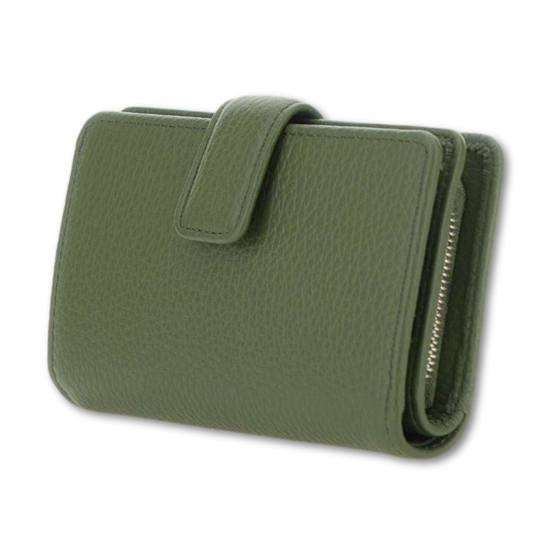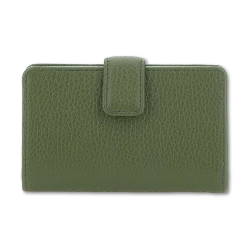 The wallet by Gianni Chiarini Firenze is made of soft hammered leather. It features a flap top closure with a snap button. Inside, it features several flat multipurpose pockets.