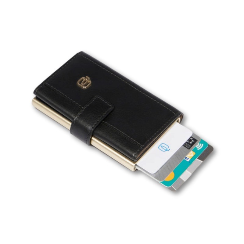 Women's automatic card holder in metal and leather, shielded with RFID protection