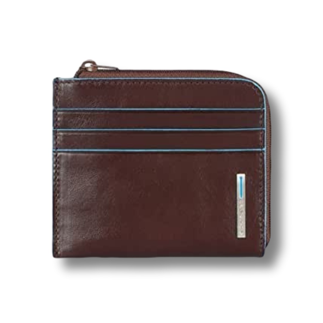 Portamonete Piquadro chiuso con zip, sistema anti frode RFID, 6 tasche porta carte di credito.