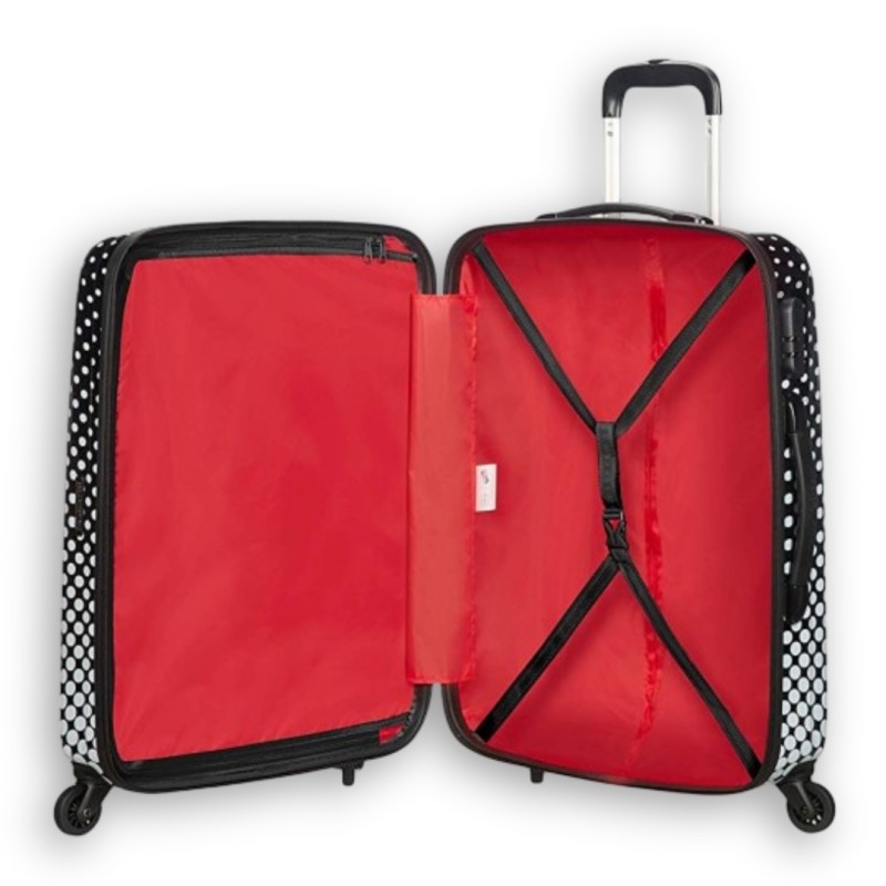 Disney: Stile American Tourister! Se nel cuore sei rimasto un bambino, non perderti queste nuove e accattivanti borse e valigie Disney. Il gusto retrò e pop art della valigia American Tourister Topolino è tutto ciò che ti serve per portare un pizzico di allegria Disney nei tuoi viaggi. Trolley 4 ruote dotata di chiusura a combinazione, cerniere con possibilità di blocco, maniglia superiore e laterale,