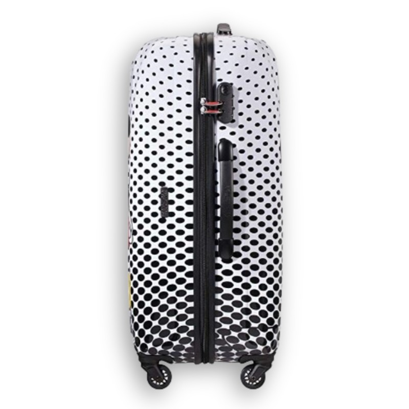 Disney: Stile American Tourister! Se nel cuore sei rimasto un bambino, non perderti queste nuove e accattivanti borse e valigie Disney. Il gusto retrò e pop art della valigia American Tourister Topolino è tutto ciò che ti serve per portare un pizzico di allegria Disney nei tuoi viaggi. Trolley 4 ruote dotata di chiusura a combinazione, cerniere con possibilità di blocco, maniglia superiore e laterale,
