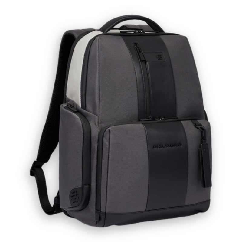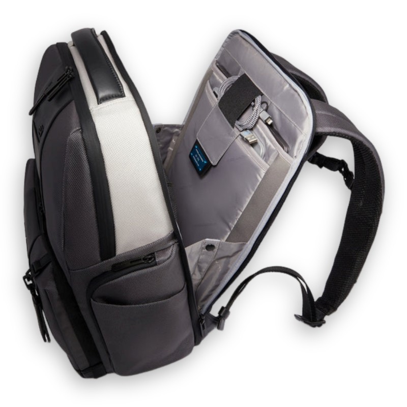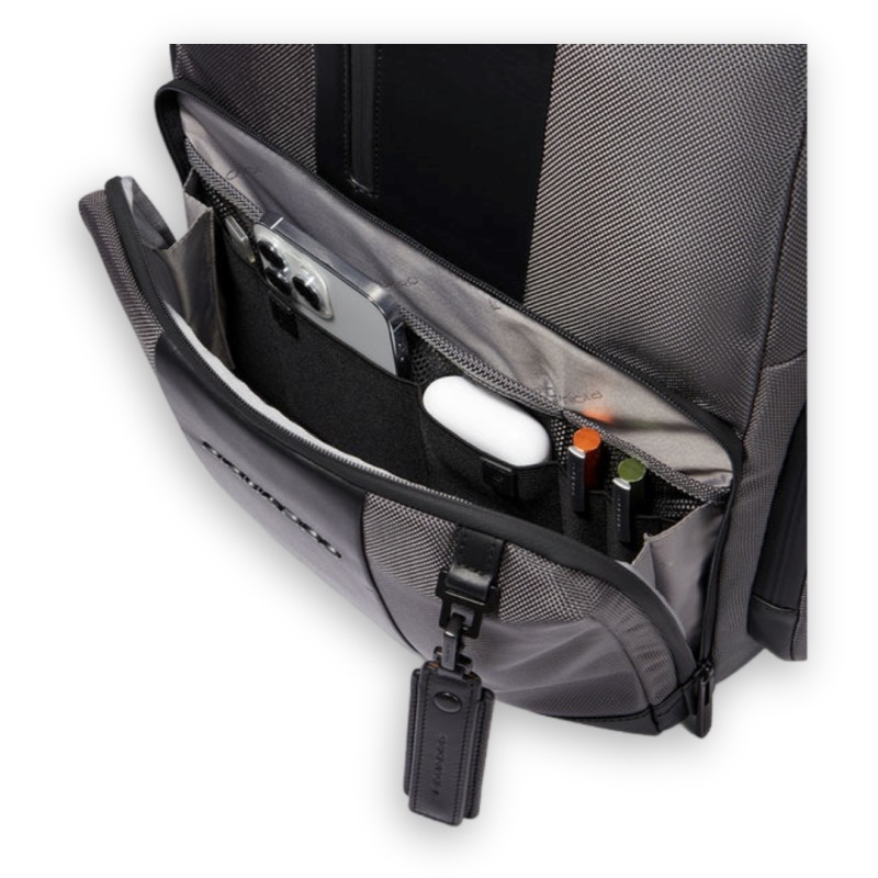 Zaino fast-check porta pc e iPad® in tessuto riciclato e pelle con cinghia sternale, protezioni antiurto e anti frode RFID e tasca per AirPods®