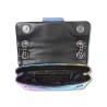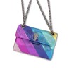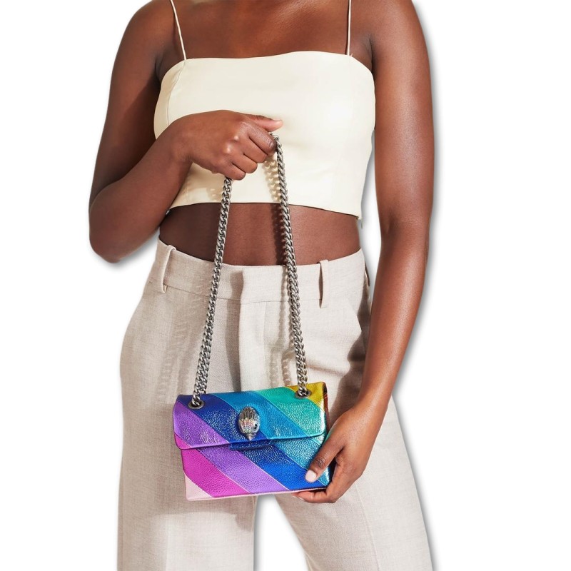 La Mini Kensington Bag è realizzata in pelle bovina grana ciottolosa laminata metallizzata con l'iconico motivo a strisce diagonali arcobaleno cucite. La testa d'aquila in argento anticato presenta cristalli color arcobaleno e occhi di perline nere sulla patta anteriore.